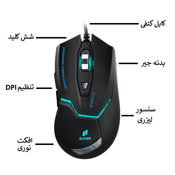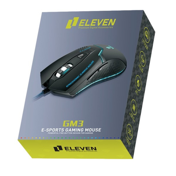 ماوس گیمینگ ELEVEN مدل GM3 یک ماوس مخصوص بازی است. بدنهی این ماوس از جنس جیر است. این طراحی خاص باعث میشود گیمرهای حرفهای بتوانند با ماوس گیمینگ GM3 در بازههای طولانی و بدون خستگی مچ دست به انجام بازیهای کامپیوتری بپردازند. این ماوس به کمک سنسور لیزری قادر است در حداکثر دقت 3600 نقطه بر اینچ (DPI) کار کند؛ البته میتوان در زمان دلخواه با فشردن یک دکمه، بین دقتهای مختلف ماوس جابهجا شد و حتی رزولوشن 1200dpi را انتخاب کرد. روی بدنهی ماوس GM3، شش عدد کلید وجود دارد که به کمک آنها میتوان کارهای خاصی را درون محیط سیستمعامل یا بازیهای کامپیوتری انجام داد. رابط اتصال ماوس به کامپیوتر، پورت USB با کابل کنفی است و با اغلب نسخههای سیستمعامل ویندوز سازگاری دارد.