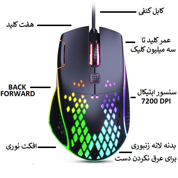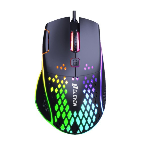 ماوس GM6 از برند ELEVEN جدیدترین ماوس گیمینگ برند ایلون هستش. این ماوس حرفه ایی با طراحی خاص باعث شده تا بعد از ساعت ها استفاده نه دست و نه مچ شما ناراحت شود. این ماوس با بدنه لانه زنبوری شما را از عرق کردن کف دست راحت میکند و نورپردازی فوق العاده ایی را به نمایش میگذارد. برای یک گیمر یکی از مهمترین قطعاتی که به صورت فیزیکی با آن در ارتباط هستش ، ماوس کامپیوتر هست به همین دلیل ماوس گیمینگ باید استاندارد ها و المان های مختلفی داسته باشد. ماوس GM6 برند ELEVEN همانطور که توضیح داده شد بدنه لانه زنبوری دارد تا از عرق کردن دست جلوگیری کند اما از دیگر اپشن های این ماوس هفت کلید بودن آن هستش که تمام امکانات را به یک گیمر میدهد و با برنامه ایی که داخل سایت خوده برند هستش شما میتوانید ماوس را شخصی سازی کنید تا لذت بازی را دو چندان کنید. کابل این ماوس به طول 1.8 متر هستش که با روکش کنفی تقویت شده تا از آسیب دیدن جلوگیری کند همچنین محل اتصال این ماوس با یک محافظ لاستیکی تقویت شده تا به هیچ عنوان آسیب نبیند. دیگر قابلیت ماوس GM6 قابلیت تنظیم حساسیت هستش که به لطف سنسور اپتیکال آن، حساسیت آن را تا عدد 7200 DPI شما میتوانید تنظیم کنید. GM6 با نورپردازی فوق العاده ظاهری زیبا به میز شما میدهد و با برنامه خود ماوس شما میتوانید نورهای آن را عوض کنید و به دلخواه خود انتخاب کنید. عمر کلید های این ماوس تا بیش از 3 میلیون کلیک هستش.