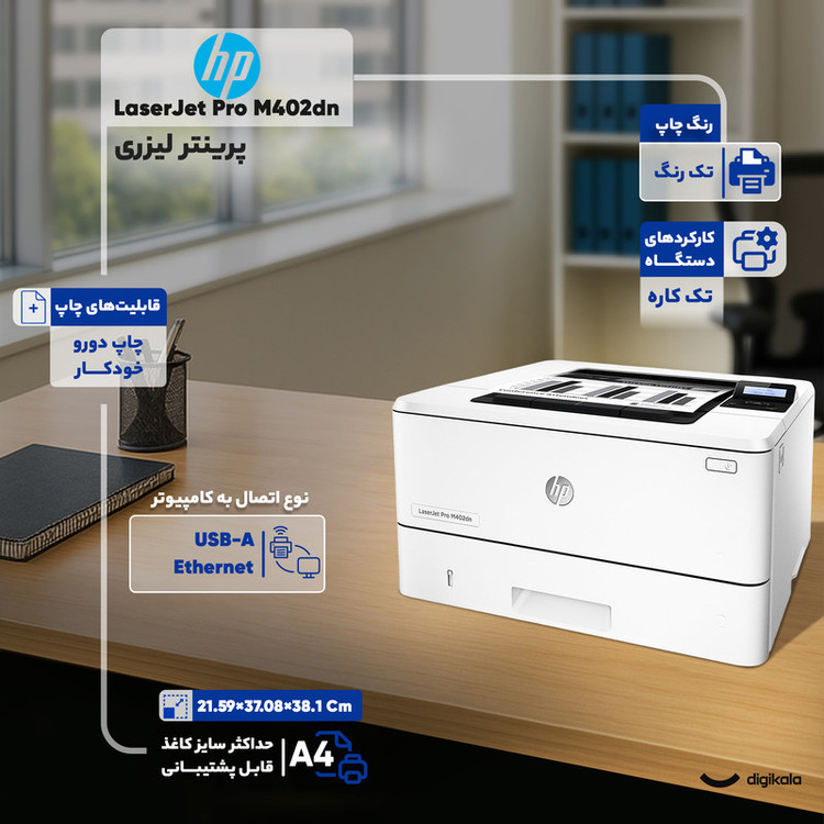 با سرعت و کیفیتی منحصربهفرد اسناد خود را با LaserJet Pro M402dn Monochrome Laser Printer ساخت شرکت «HP» چاپ کنید. با سرعت چاپ خارقالعادهی 40 برگ در دقیقه و وضوح چاپ 1200 × 1200 dpi M402dn، قادر است اسناد شما را باکیفیتی ایدهآل به چاپ برساند. علاوه بر سرعت فوقالعادهی چاپ، M402dn در کمتر از 5.6 ثانیه اولین برگه را چاپ میکند. همچنین M402dn به سیستم چاپ دوروی اتوماتیک «Duplex Printing» مجهز شده است که درنتیجهی آن دیگر لازم نیست برای چاپ بر هر دو روی برگه خودتان بهصورت دستی برگه را پشتورو کنید بلکه دستگاه بهصورت اتوماتیک بر هردوی روی برگه چاپ میکند و بدین شکل میتوانید در زمان و هزینههای خود صرفهجویی کنید. کاغذ مصرفی دستگاه از دو سینی با ظرفیت کلی 350 برگ تأمین میشود. همچنین صفحهنمایشی 2 خطی با نور پسزمینه در دستگاه تعبیهشده که با استفاده از آن میتوانید عملکردهای دستگاه را کنترل کنید. M402dn قادر است ماهانه حداکثر تا 80.000 صفحه را چاپ کند اما بهتر است برای حفظ عملکرد و سلامت دستگاه و اطمینان از دوام و طول عمر پرینتر به توصیهی شرکت سازنده بین 750 تا 4000 برگه چاپ کنید. با قابلیت «Auto-On/Auto-Off» در مصرف برق صرفهجویی کنید. ازآنجاکه ممکن است پرینتر را در محیط اداره و یا شبکهی خانگی خود به اشتراک بگذارید، نمیتوانید برای هر بار چاپ به سمت پرینتر رفته و آن را روشن کنید و پس از اتمام کار خود آن را خاموش کنید. از طرفی با همیشه روشن گذاشتن دستگاه برق به هدر خواهد رفت. اما با این تکنولوژی دستگاه در مواقع نیاز خود روشنشده و پس از اتمام کار بعد از مدتی بهصورت اتوماتیک خاموش میشود. M402dn به ویژگیهای خاصی تجهیز شده است که درنتیجهی آن امنیت حفظ اطلاعات در درون شبکه حفظ شده و میتوانید با خیال راحت و بدون نگرانی از دسترسی دیگران به اسناد شما در درون شبکه آنها را چاپ کنید.